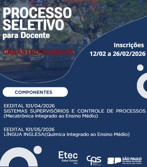 A SUPERINTENDENTE DA ESCOLA TÉCNICA ESTADUAL SALES GOMES FAZ SABER QUE NO PERÍODO DE 12/02/2026 a 26/02/2026, ESTARÃO ABERTAS AS INSCRIÇÕES PARA OS PROCESSOS SELETIVOS SIMPLIFICADO PARA PROFESSOR DE ENSINO MÉDIO E TÉCNICO NOS SEGUINTES COMPONENTES/CURSOS: